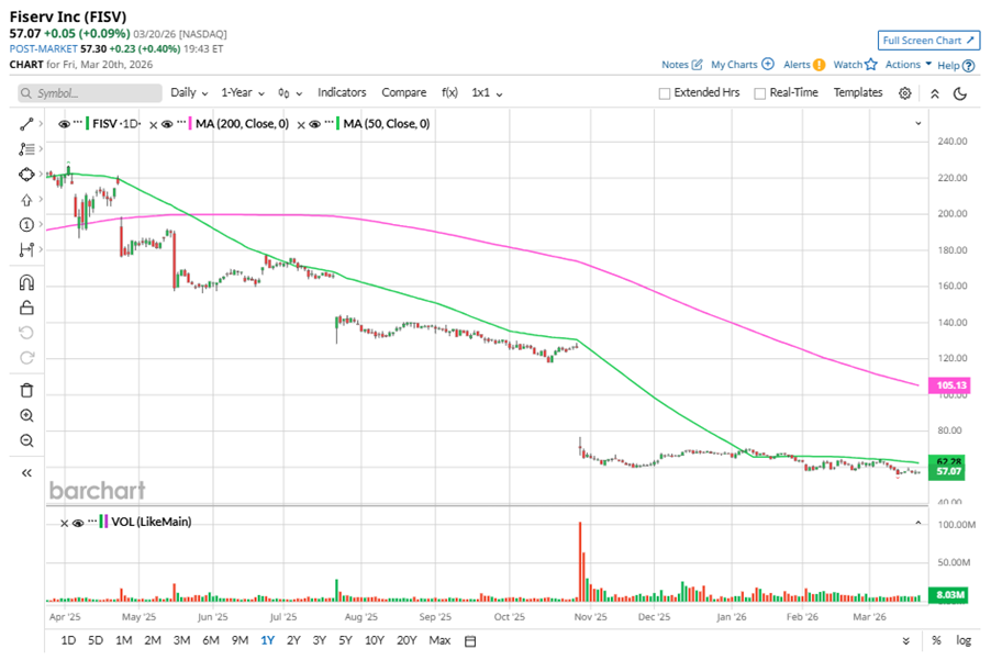 To confirm the bearish trend, FISV has been trading below its 200-day moving average since late April, 2025. The stock has been trading below its 50-day moving average over the past year, with minor fluctuations.