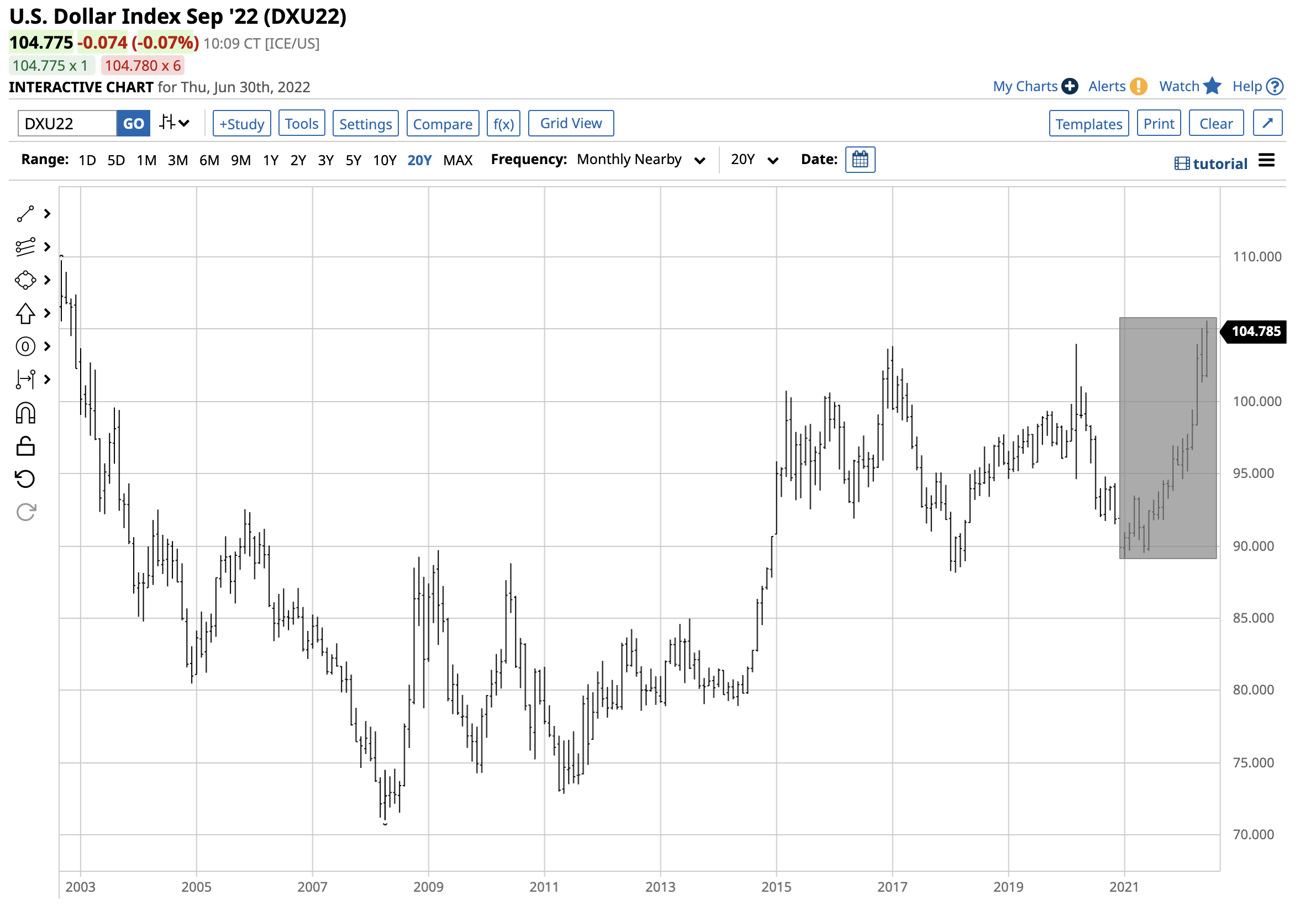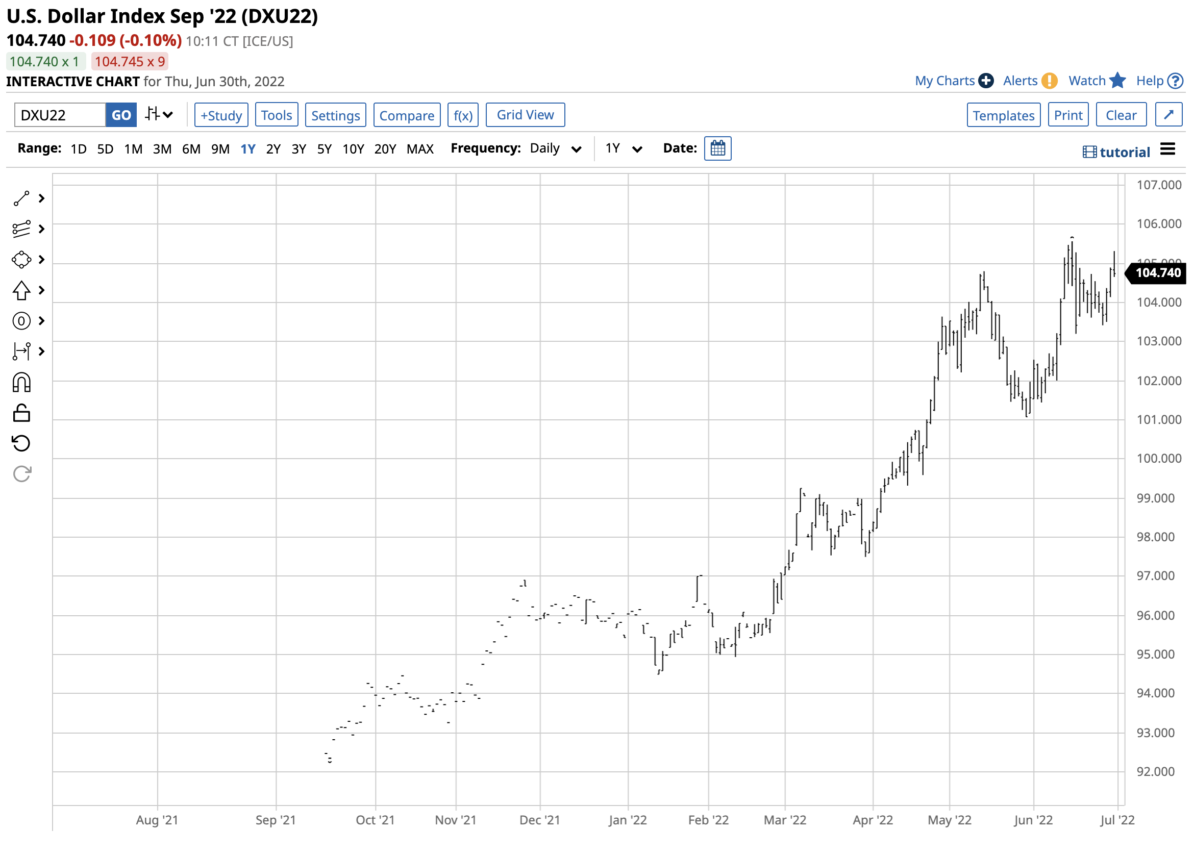 The chart shows that at 104.740 on June 30, the dollar index moved 6.9% higher.