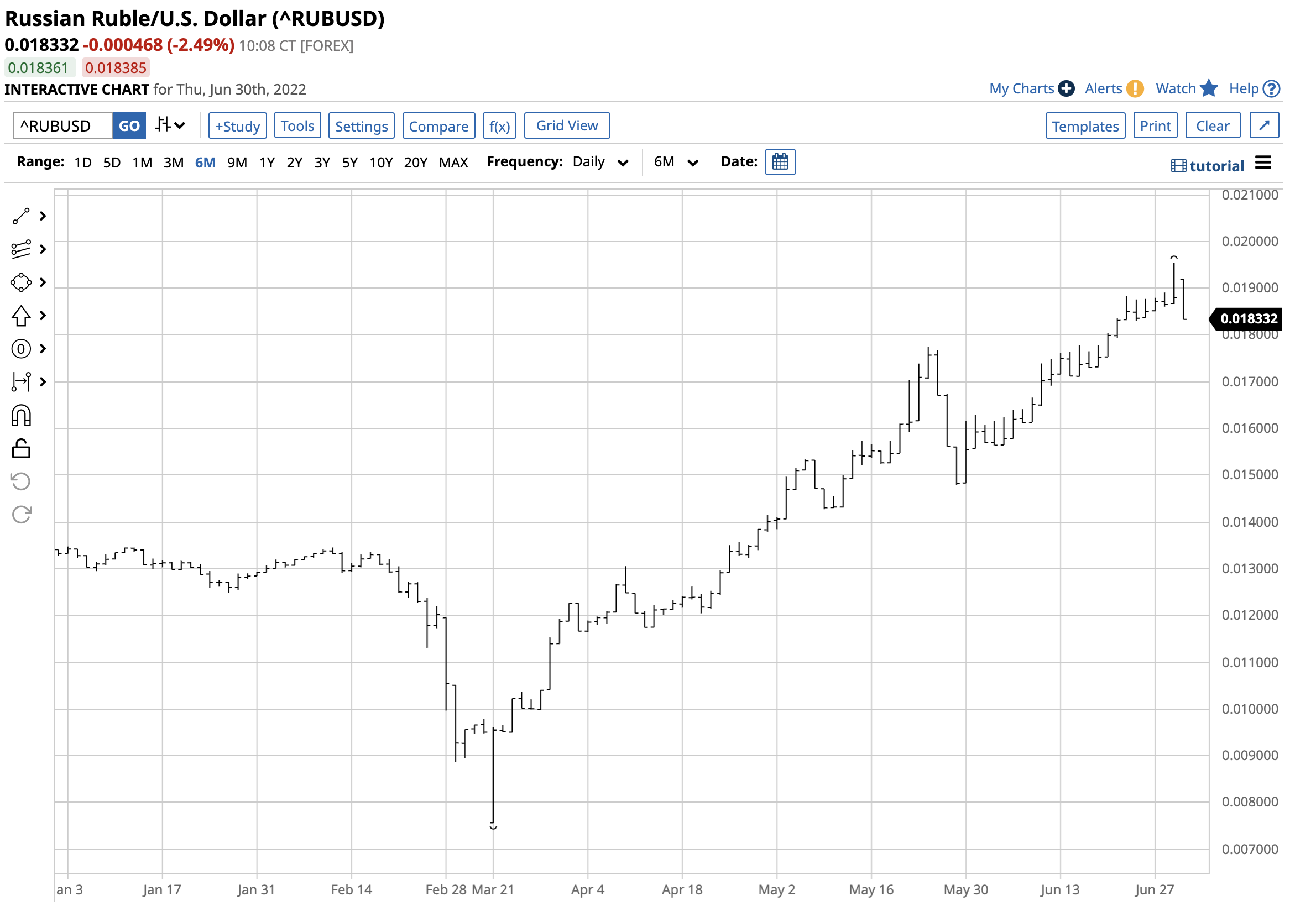 Meanwhile, the currency relationship between the US and Russian currencies moved from $0.00757 on March 21 to $0.018332 on June 30, an over 142% gain over the period.