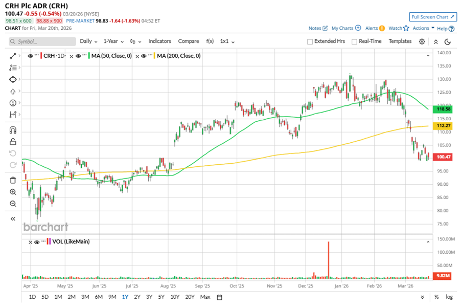 Despite its notable strength, CRH slipped 23.6% from its 52-week high of $131.55, achieved on Jan. 9. Over the past three months, CRH stock declined 19.3%, underperforming the Invesco Building & Construction ETF’s (PKB) 1.1% dip during the same time frame.