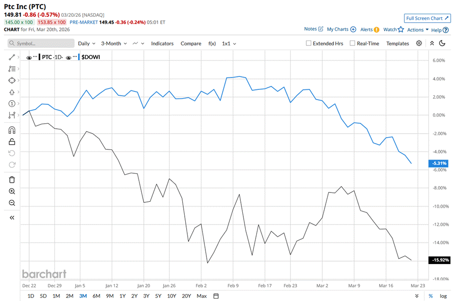 However, PTC stock is down 31.8% from its 52-week high of $219.69 touched on July, 31, 2025. Moreover, PTC has been on a downward trajectory lately, declining 15.9% over the past three months and lagging behind the Dow Jones Industrials Average ($DOWI), which declined 5.3% during the same period.