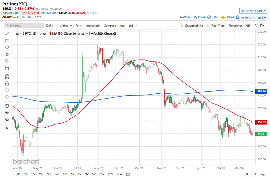 PTC stock has been stuck in a weak trend for a while now, staying below its 200-day moving average since November, which signals longer-term pressure. It has also remained under its 50-day moving average for most of the past year, despite a brief uptick earlier this month that quickly faded, pulling the stock back down again.