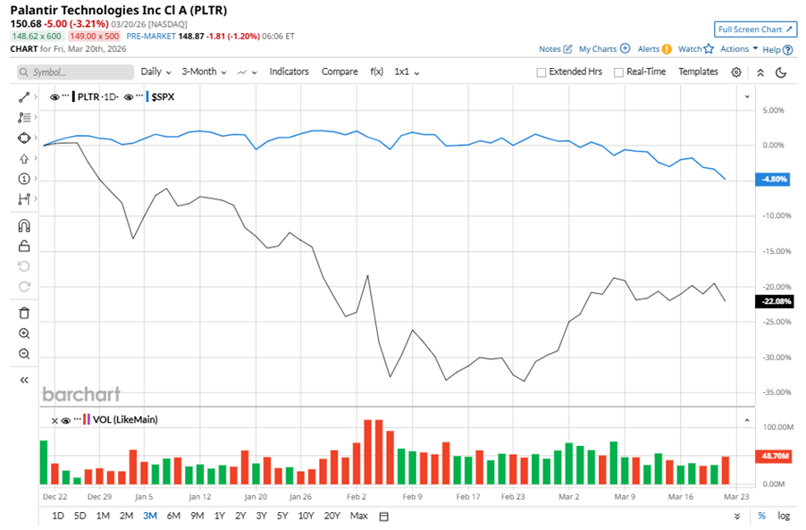 Despite its notable strength, PLTR shares slipped 27.4% from their 52-week high of $207.52, achieved on Nov. 3, 2025. Over the past three months, PLTR stock has declined 22.1%, underperforming the S&P 500 Index’s ($SPX) 4.8% decline during the same time frame.