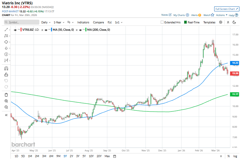 Viatris has been trading above its 200-day moving average since late September 2025 and has slipped under its 50-day moving average recently.