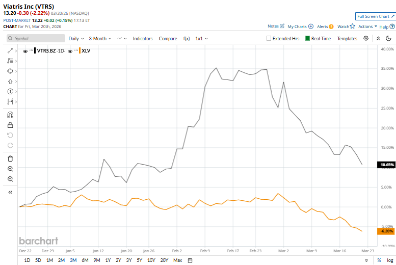 This healthcare company is currently trading 19.9% below its 52-week high of $16.47, reached on Feb. 26. Shares of Viatris have soared 10.7% over the past three months, outpacing the State Street Health Care Select Sector SPDR Fund’s (XLV) 6.2% fall.