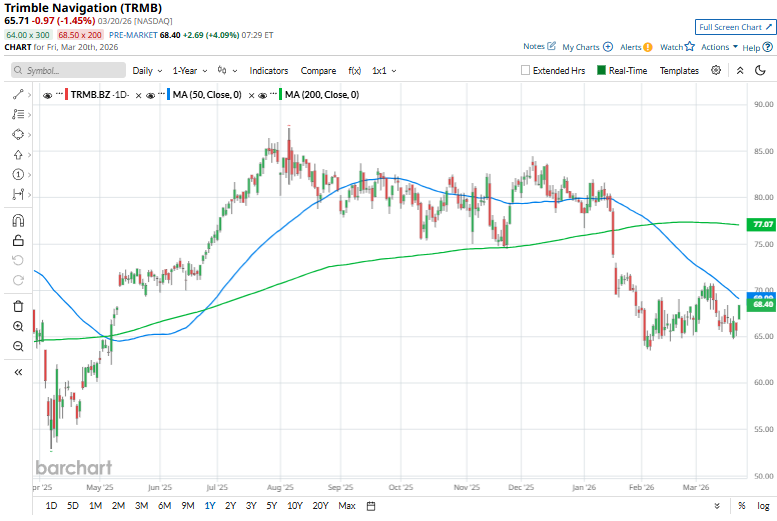 Indicating a downtrend, TRMB stock has been trading below its 50-day and 200-day moving averages since mid-January.