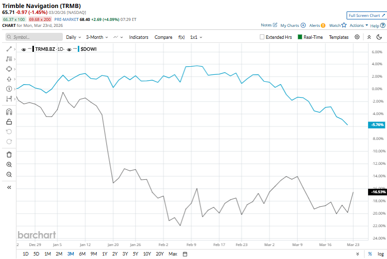 Trimble touched its 52-week high of $87.50 on Aug. 6 and is currently trading 24.9% below that peak. Meanwhile, TRMB stock prices have dipped 18.8% over the past three months, compared to the Dow Jones Industrial Average’s ($DOWI) 5.3% decline during the same time frame.