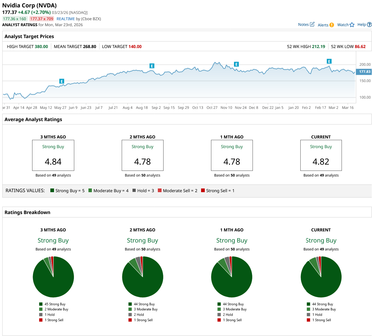 Out of the 49 analysts covering NVDA stock, 44 recommend “Strong Buy,” three recommend “Moderate Buy,” one recommends “Hold,” and one recommends “Strong Sell.” The average NVDA stock price target is $268.80, above the current price of about $177.