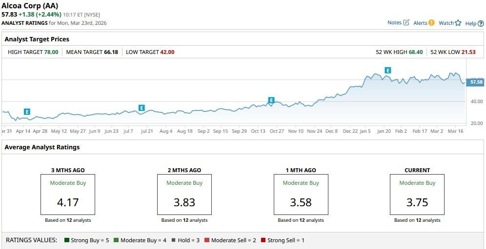 The consensus rating on AA stock sits at “Moderate Buy,” with the mean price target of about $66 indicating potential upside of roughly 15% from here.