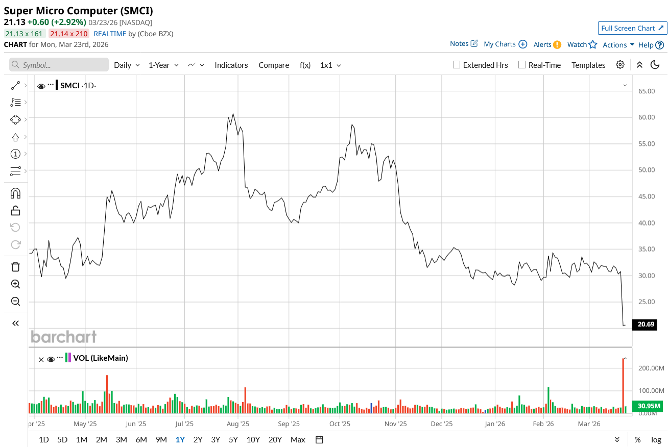 Valued at a market cap of $12.3 billion, SMCI stock is down 52% over the past year.