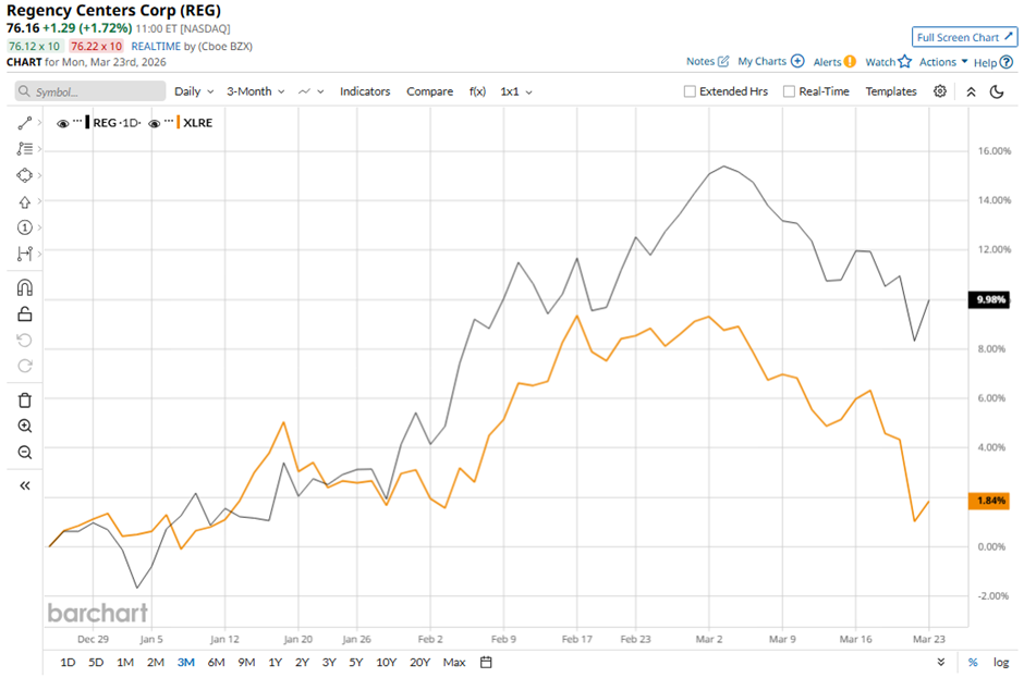 Shares of the Jacksonville, Florida-based company have declined 4.7% from its 52-week high of $79.89. REG stock has risen 9.5% over the past three months, outpacing the State Street Real Estate Select Sector SPDR ETF's (XLRE) 1.7% rise over the same time frame.