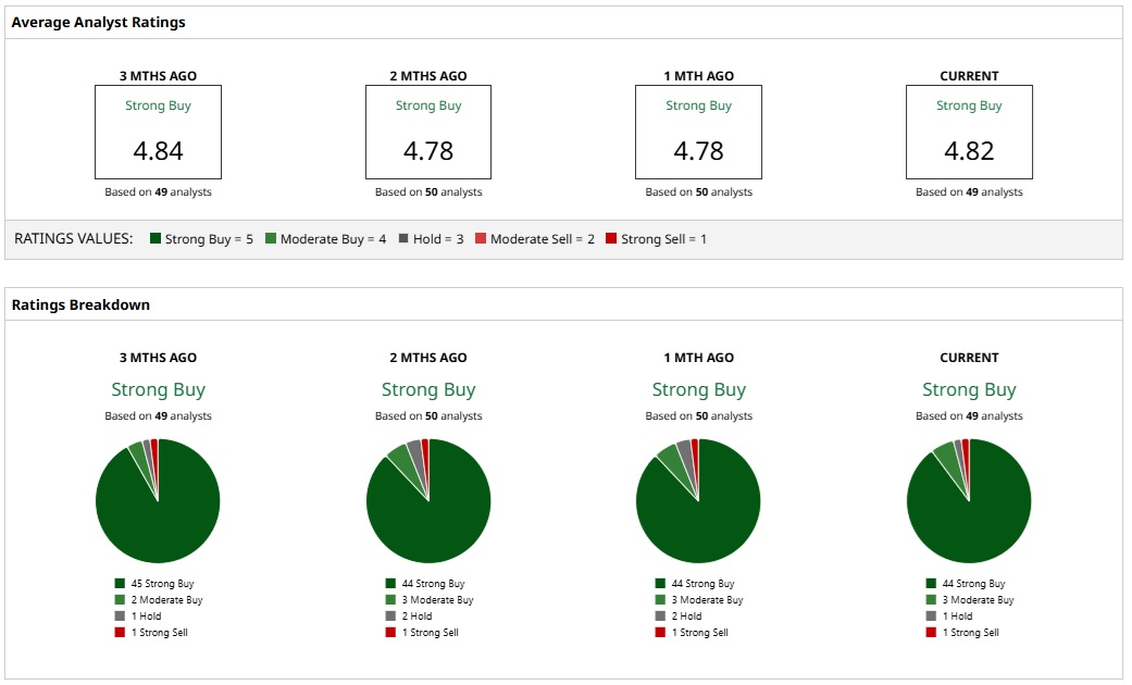 Based on 49 analysts with coverage, NVDA stock is a consensus “Strong Buy.” A majority of 44 analysts have a “Strong Buy” rating for Nvidia, while three analysts have a “Moderate Buy” rating, and one anlayst has a “Hold” rating. On the bearish side, one analyst has a “Strong Sell" rating.