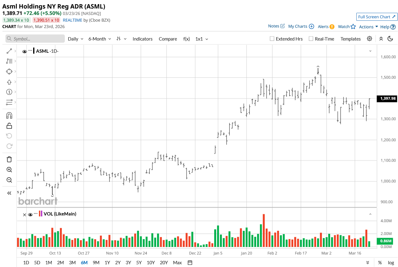 TD Cowen analyst Krish Sankar maintains a "Buy" rating on ASML with a price target of €1,500 ($1,735), representing a valuation of 48 times projected 2027 earnings, and is about 25% higher than its current price level. This bullish outlook comes as ASML’s U.S.-listed shares have retreated 7% over the past month, creating what analysts describe as a "very attractive" entry point.