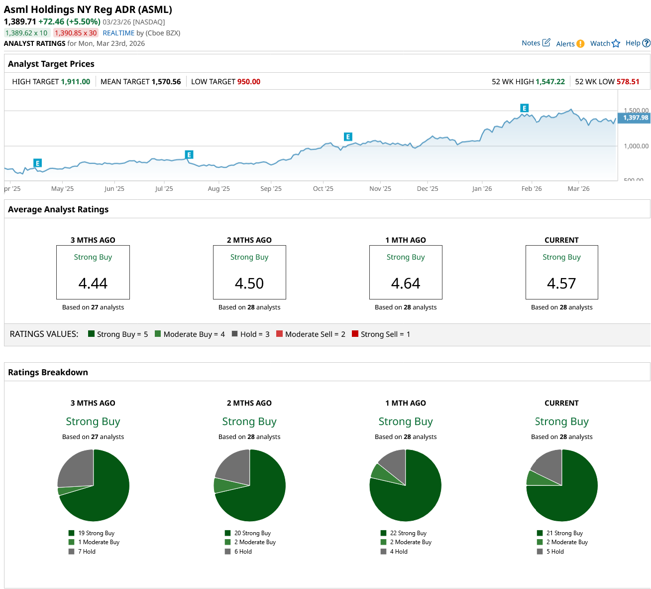 ASML remains a cornerstone of the semiconductor industry, bolstered by a "Strong Buy" consensus from 28 analysts. With 21 "Strong Buy" and TWO "Moderate Buy" ratings, the professional sentiment is overwhelmingly positive. The mean price target of $1,570.56 suggests a significant 13% upside potential from current market levels, driven by the company’s monopoly on EUV lithography tools, which are essential for the AI revolution.