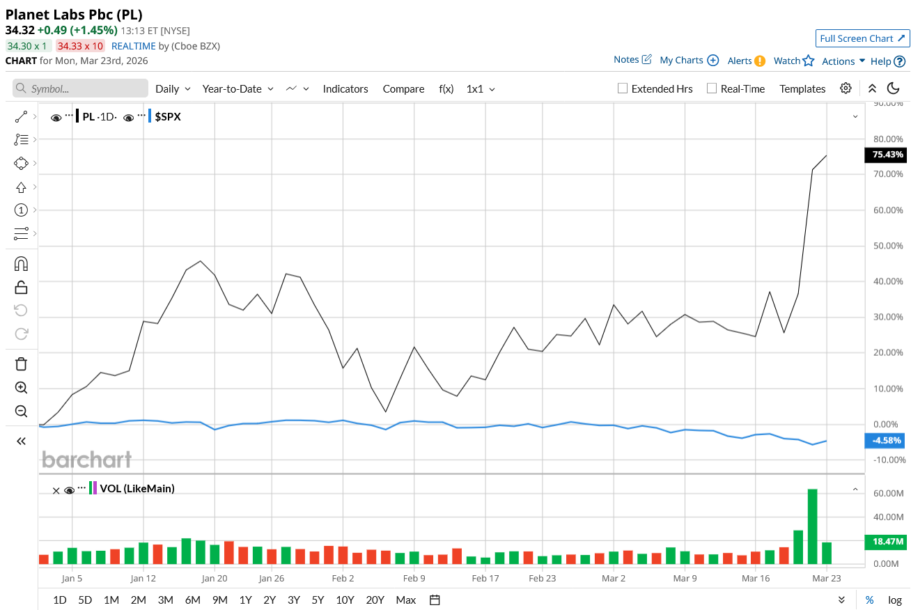 Planet Labs (PL) has been one of the most surprising winners in the market this year. The stock is up 74% year-to-date (YTD), wildly outperforming the S&P 500 Index ($SPX) and most big tech stocks. The current global scenario is stressful, with the U.S.-Iran-Israel war escalating, making real-time Earth observation mission-critical. Planet Labs, which operates a network of satellites that capture and analyze daily images of the Earth, has quietly built one of the most valuable AI-powered data platforms that governments can rely on.