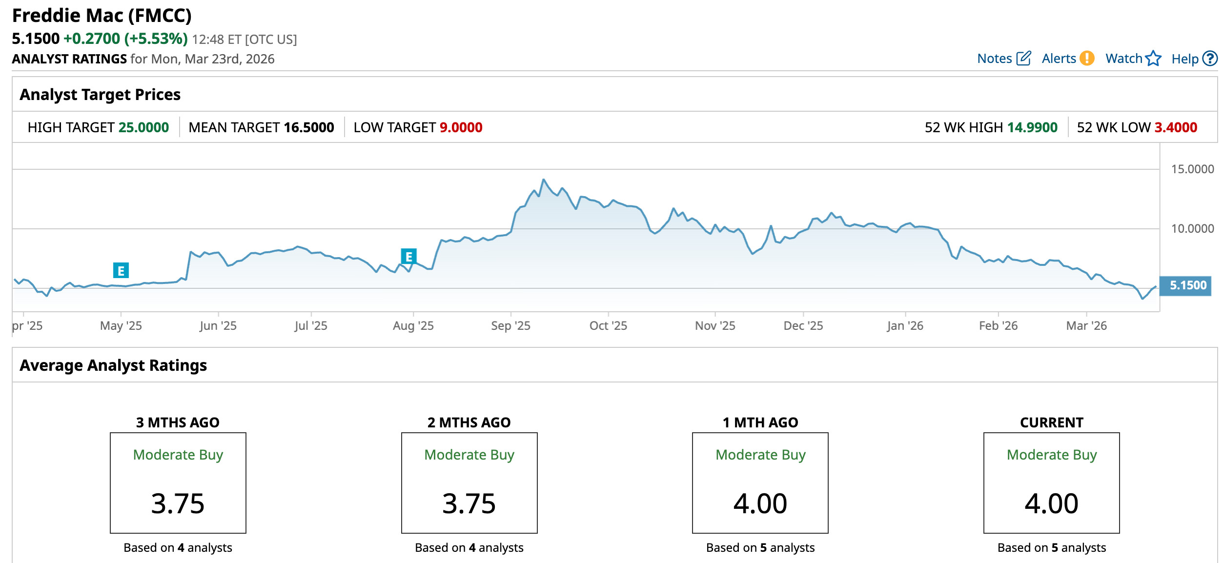 Analyst coverage for Freddie Mac is extremely limited due to its status as a government-sponsored enterprise trading over-the-counter.