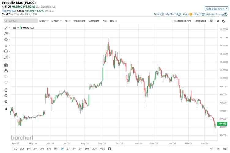 FMCC has plunged 67.1% from its 52-week high of around $14.99, reached in September 2025, with an overall decline of 4.5% over the past year. The stock recently slid to its 52-week low of $3.40 on Mar. 19.