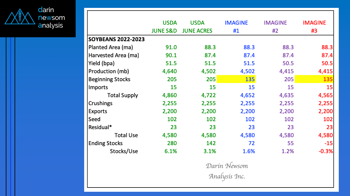 - In the case of US soybeans, the biggest unknown is what 2021-2022 ending stocks/2022-2023 beginning stocks will actually be.