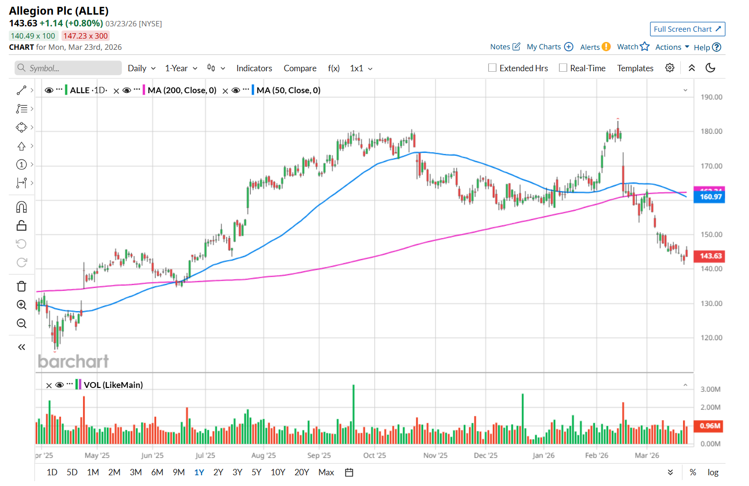 On Feb. 17, ALLE shares plunged 9.4% after reporting its Q4 results. Its adjusted EPS of $1.94 fell short of analyst expectations of $2.01. Moreover, ALLE expects fiscal 2026 adjusted EPS in the range of $8.70 to $8.90, which came in below consensus expectations. Softness in residential markets affected its results. However, due to strong non-residential demand and electronics growth, the company’s revenue increased 9.3% year-over-year to $1 billion, meeting Wall Street forecasts.