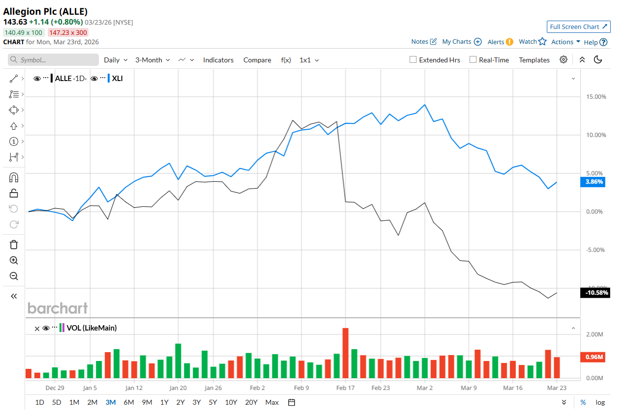 This security products and solutions provider has slipped 21.6% from its 52-week high of $183.11, reached on Feb. 12. Shares of Allegion have declined 10.6% over the past three months, trailing the State Street Industrial Select Sector SPDR ETF’s (XLI) 3.9% rise during the same time frame.