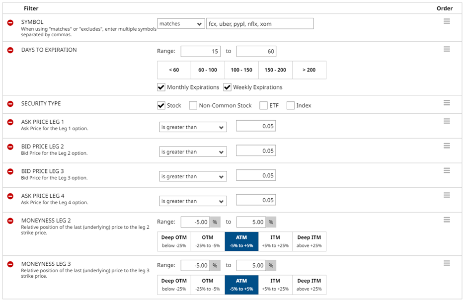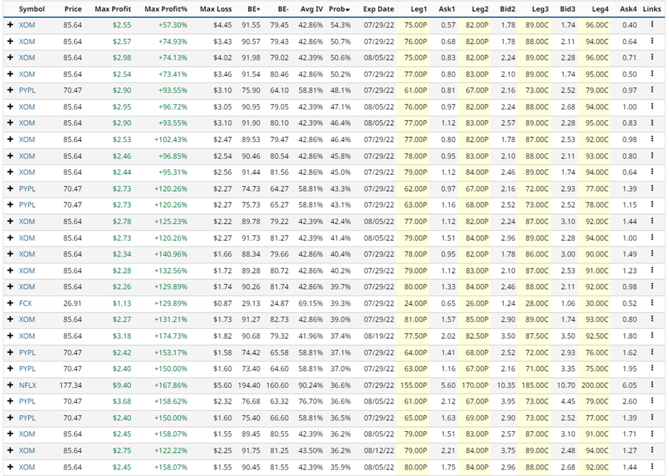 We can see that Freeport McMoran (FCX), Uber Technologies (UBER), PayPal (PYPL), Netflix (NFLX), Alphabet (GOOGL) and Exxon Mobil (XOM) among others have both a high IV Percentile and IV Rank, so let’s use some of those stocks in our Iron Condor Screener.