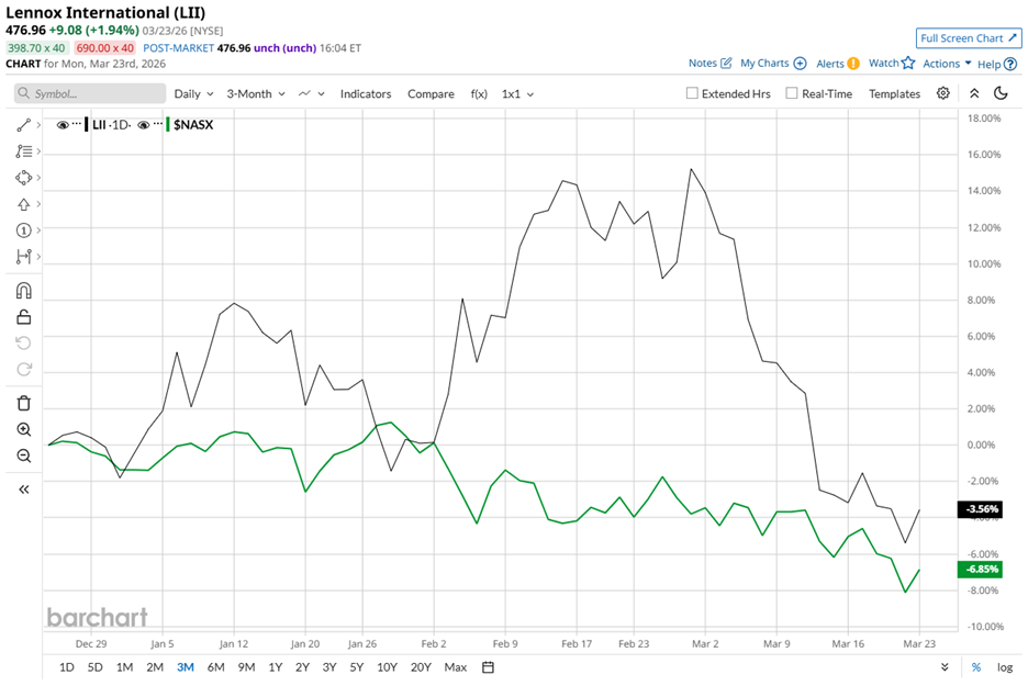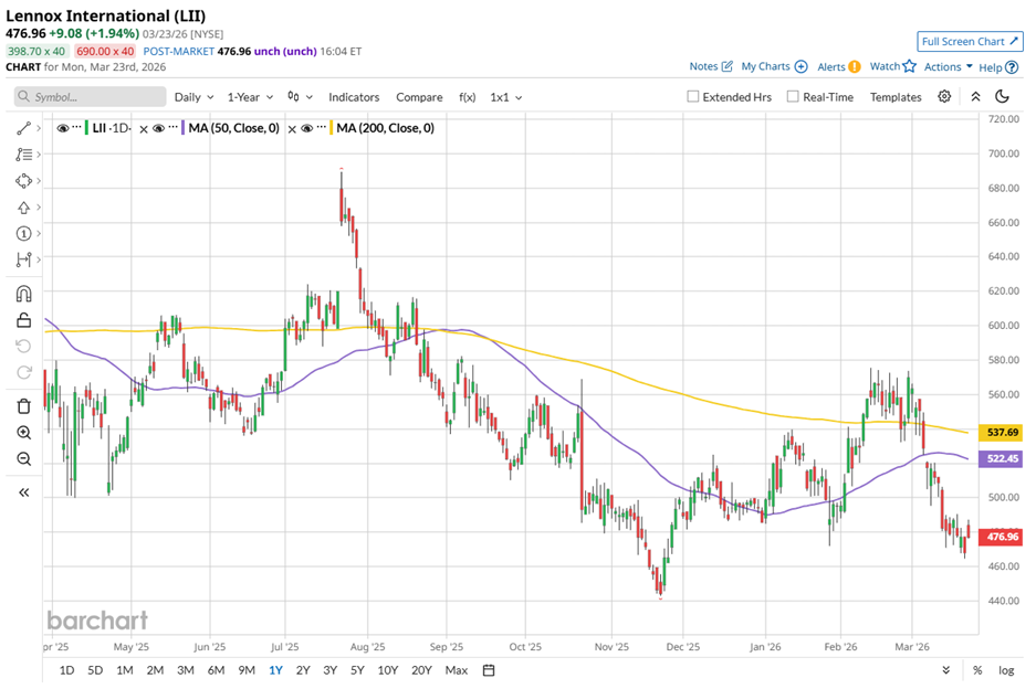 Over the past 52 weeks, LII stock has declined 16.3%, sharply lagging the Nasdaq’s 23.4% gain and reflecting a clear loss of momentum. The tone has carried into 2026, with Lennox’s shares slipping 1.8% year-to-date (YTD), even as the broader index has dropped a steeper 5.6%.
