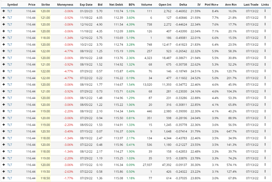 If TLT closes above 120 on the expiration date, the shares will be called away at 120, leaving the trader with a total profit of $926 (gain on the shares plus the $570 option premium received). That equates to an 8.36% return, which is 16.0% on an annualized basis.