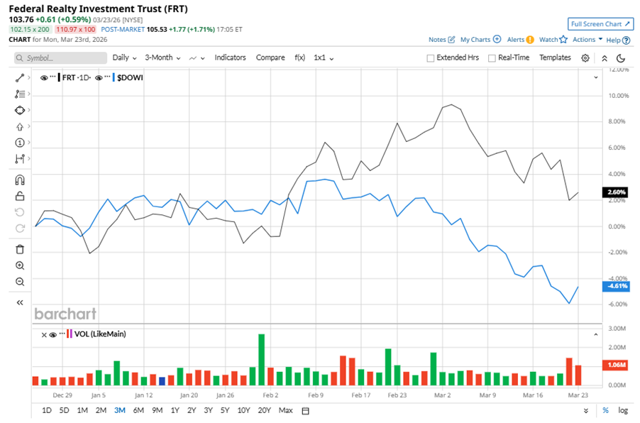 Despite its notable strength, FRT slipped 6.4% from its 52-week high of $110.89, achieved on Mar. 3. Over the past three months, FRT stock gained 2.6%, outperforming the Dow Jones Industrials Average’s ($DOWI) 4.6% dip during the same time frame.