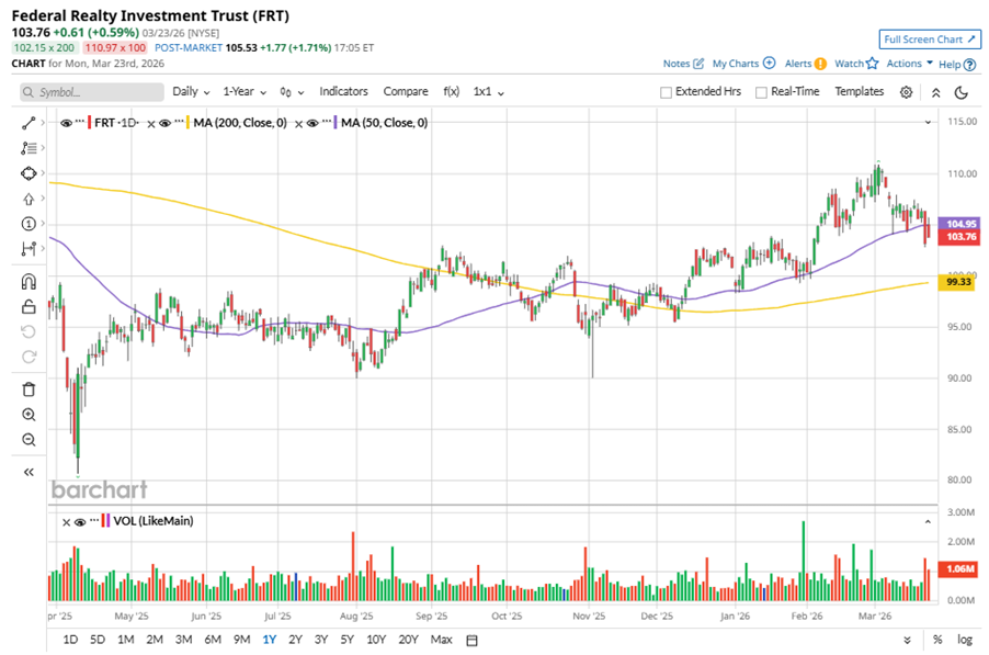 To confirm the bullish trend, FRT has been trading above its 200-day moving average since late November, 2025, with slight fluctuations. However, the stock has been trading below its 50-day moving average recently.
