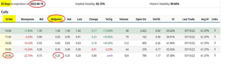 The Barchart option chain below shows that the Aug. 19 call options offer the $7.50 strike price calls at 38 cents at the midpoint.
