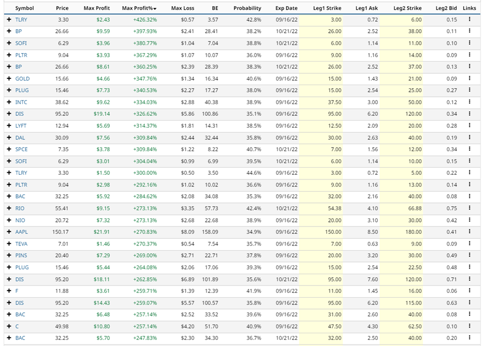 As you can see, the scanner shows some interesting Iron Condor trades on stocks such as TLRY, BP, SOFI, PLTR, GOLD, PLUG, INTC and DIS.