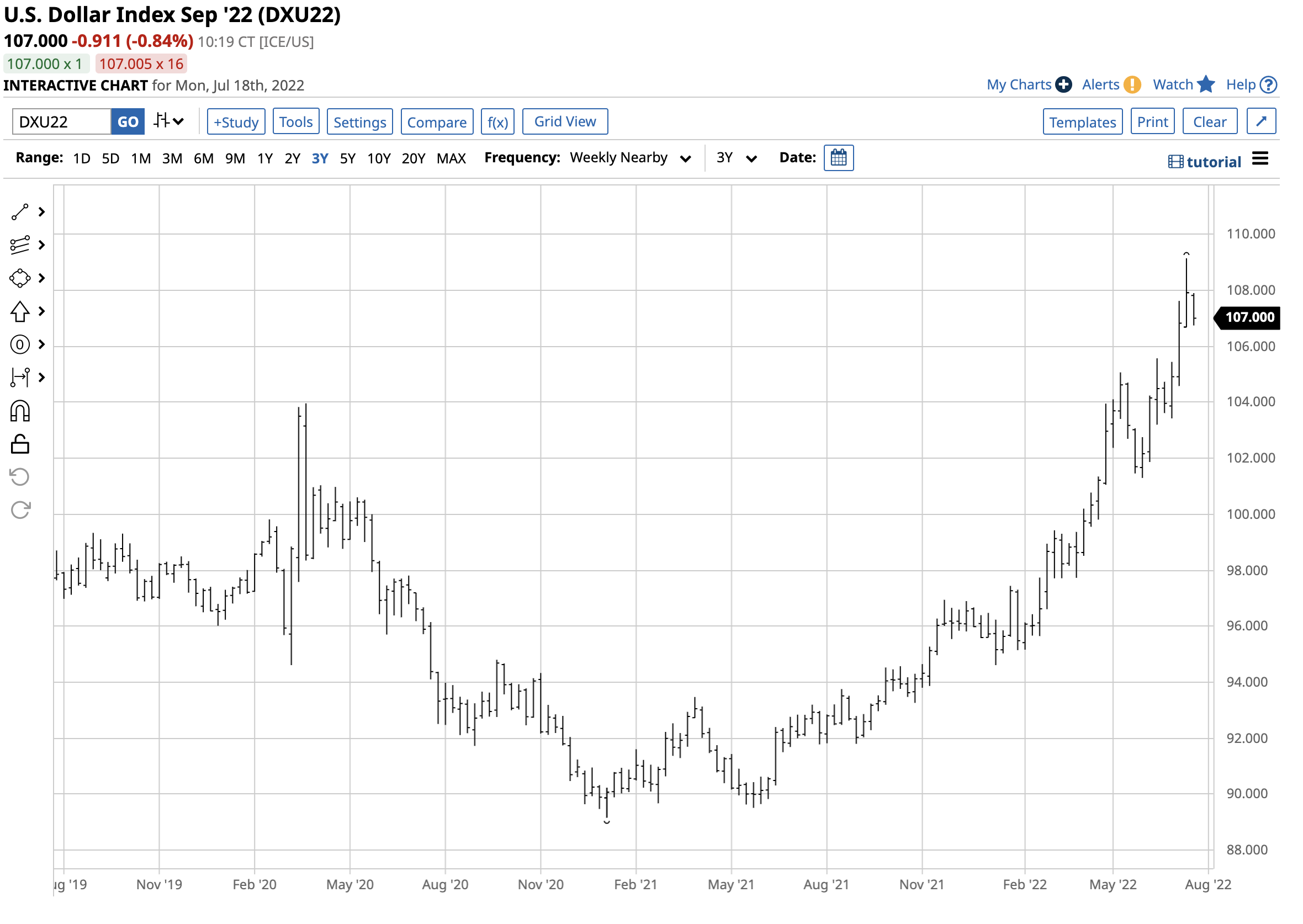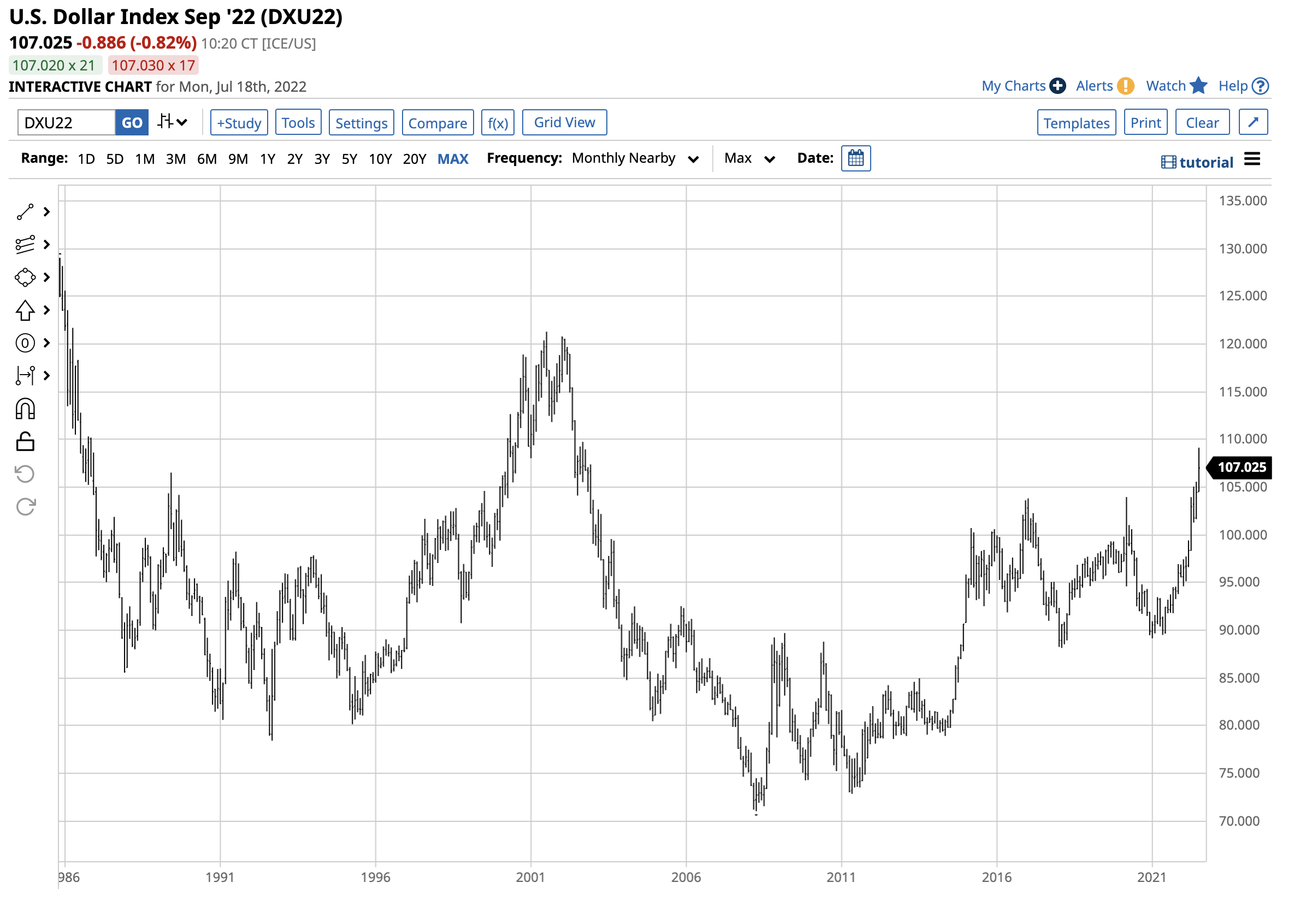 The long-term chart of the dollar index dating back to the beginning of the European Union and the birth of the euro currency highlights the upside target for the index stands at the July 2001 121.290 high, 11.13% above last week’s 109.140 high. The index settled at the 107.911 on July 15 after rising to the 109.140 peak on July 14. It was around the 107 level on Monday, July 18.