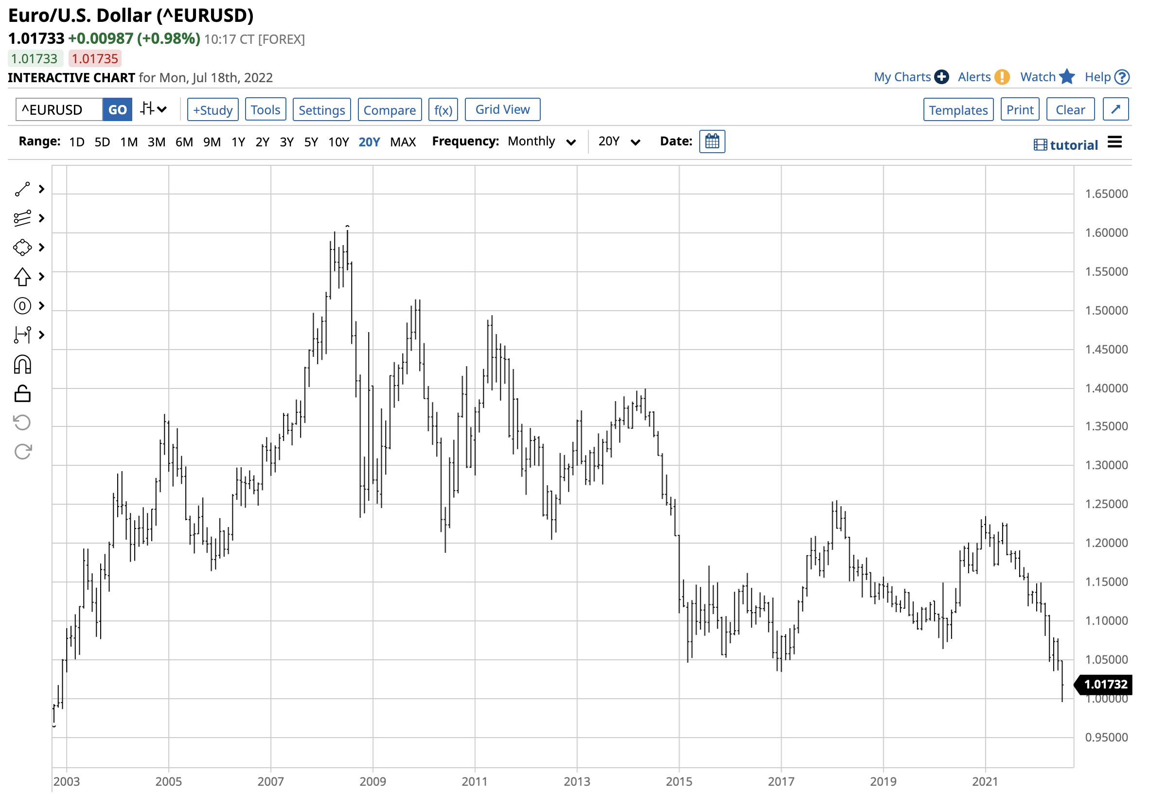 The chart shows that the last time the euro traded at parity against the US dollar was in December 2002. Last week, the price briefly probed below parity and was just above that level on Monday, July 18.