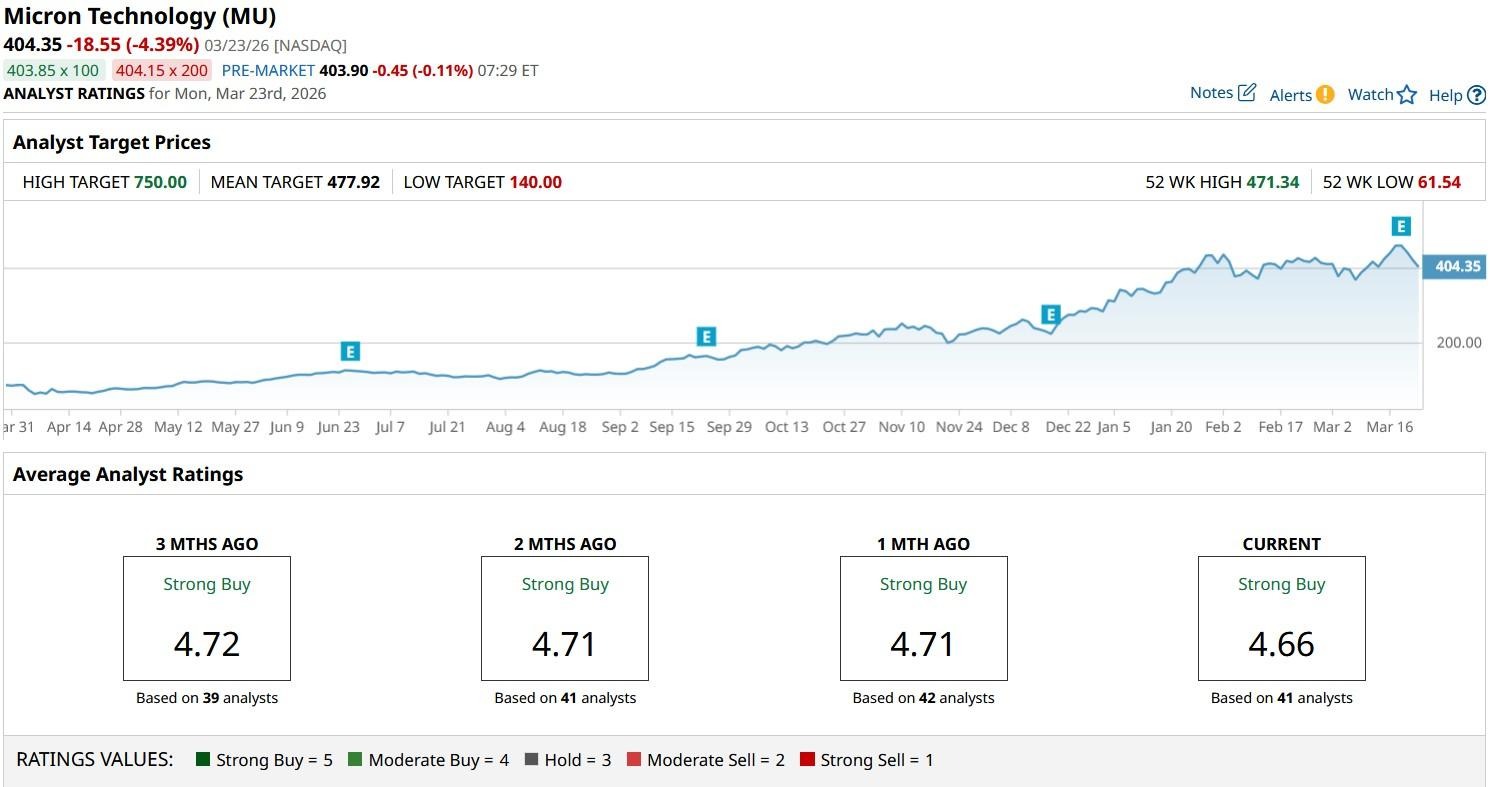 The consensus rating on MU stock currently sits at “Strong Buy," with price targets as high as $750, indicating potential upside of nearly 85% from here.
