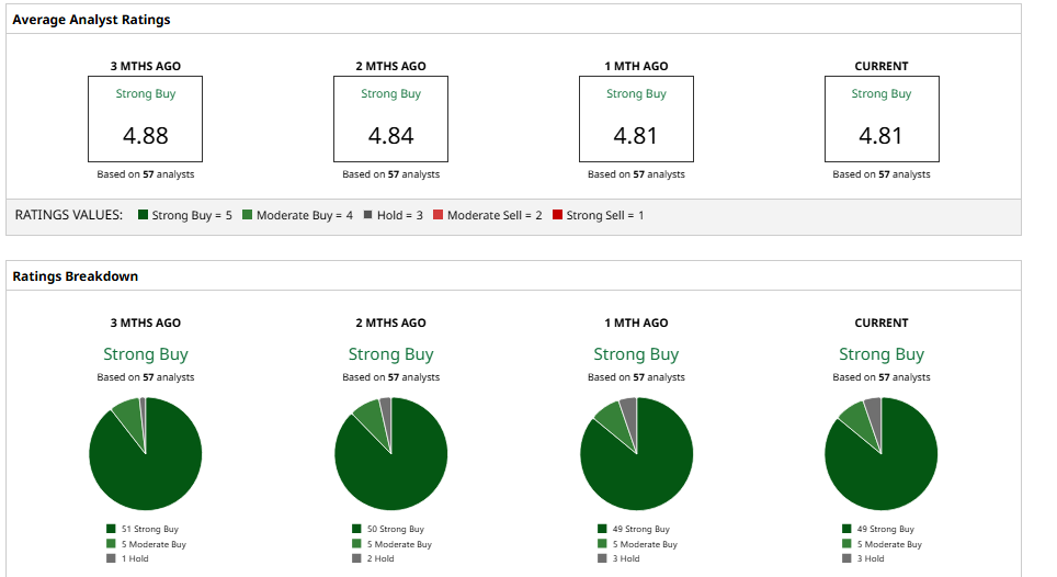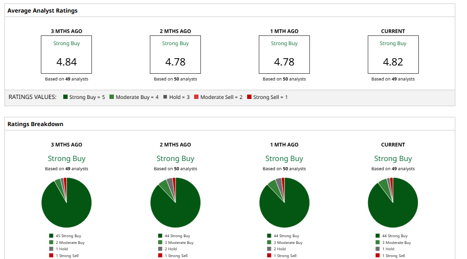 Wall Street looks highly bullish on NVDA stock. The group of 49 analysts has a consensus “Strong Buy” rating with a mean price target of roughly $269, which suggests almost 56% upside from here.