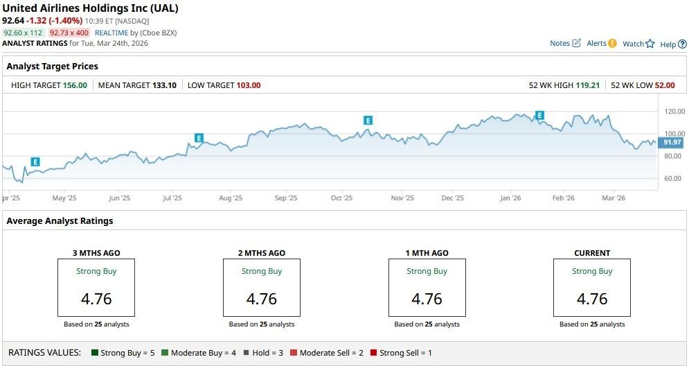 The consensus rating on UAL stock sits at a “Strong Buy,” with the mean target of $133 indicating potential upside of about 45% from here.