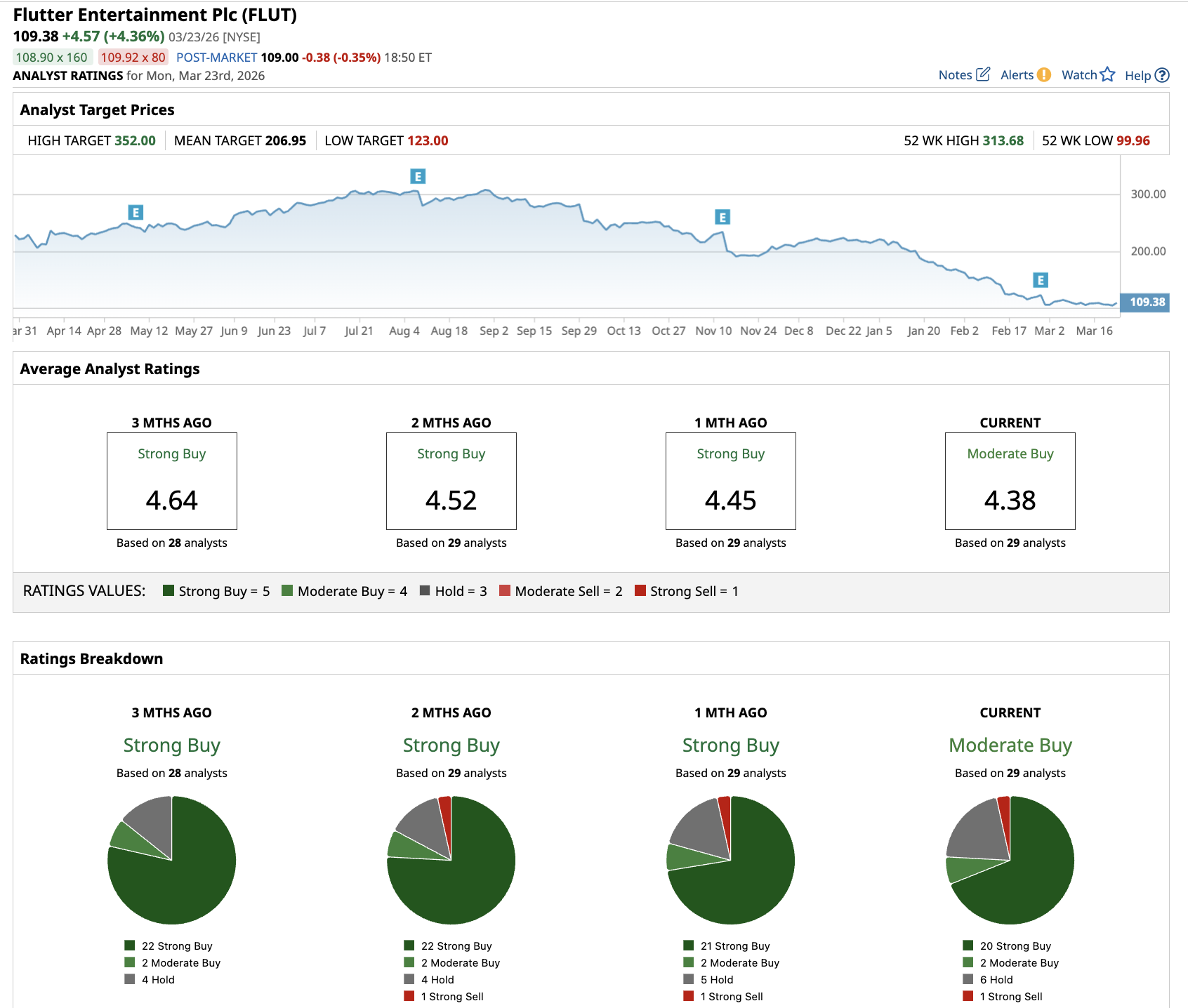Out of the 29 analysts covering FLUT stock, 20 recommend “Strong Buy,” two recommend “Moderate Buy,” six recommend “Hold,” and one recommends “Strong Sell.” The average Flutter stock price target is $206.95, above the current price of about $109.