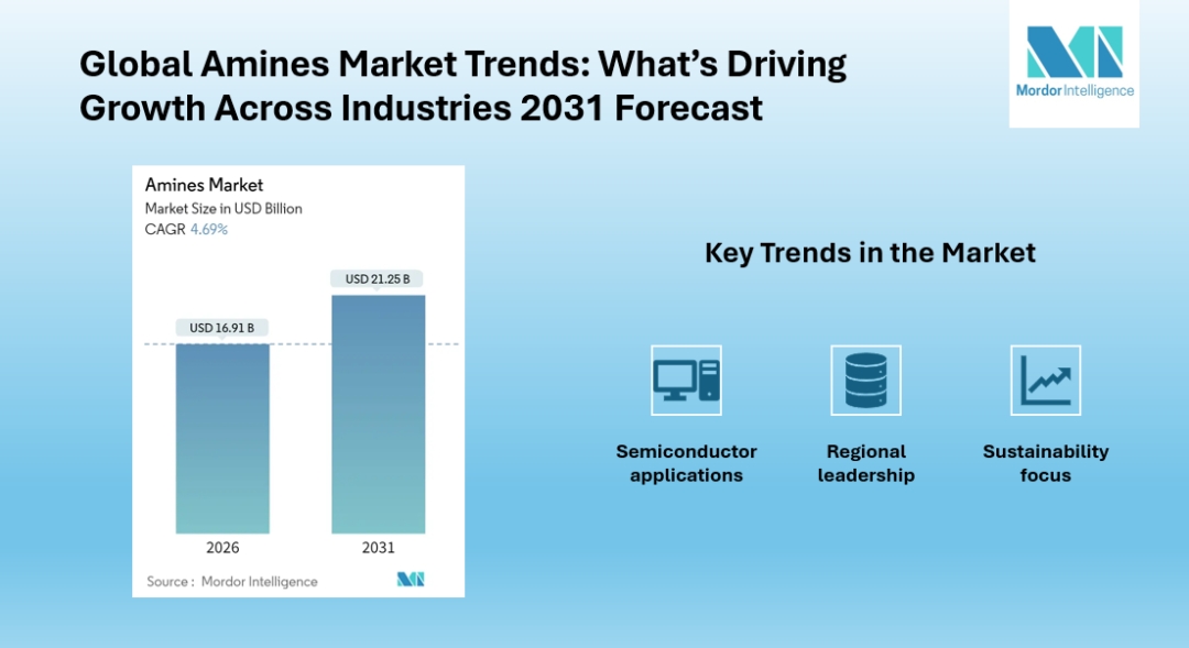 To view the original version on ABNewswire visit: Amines Market Set to Reach USD 21.25 Billion by 2031, Strong Growth in Agrochemicals and Personal Care | Mordor Intelligence