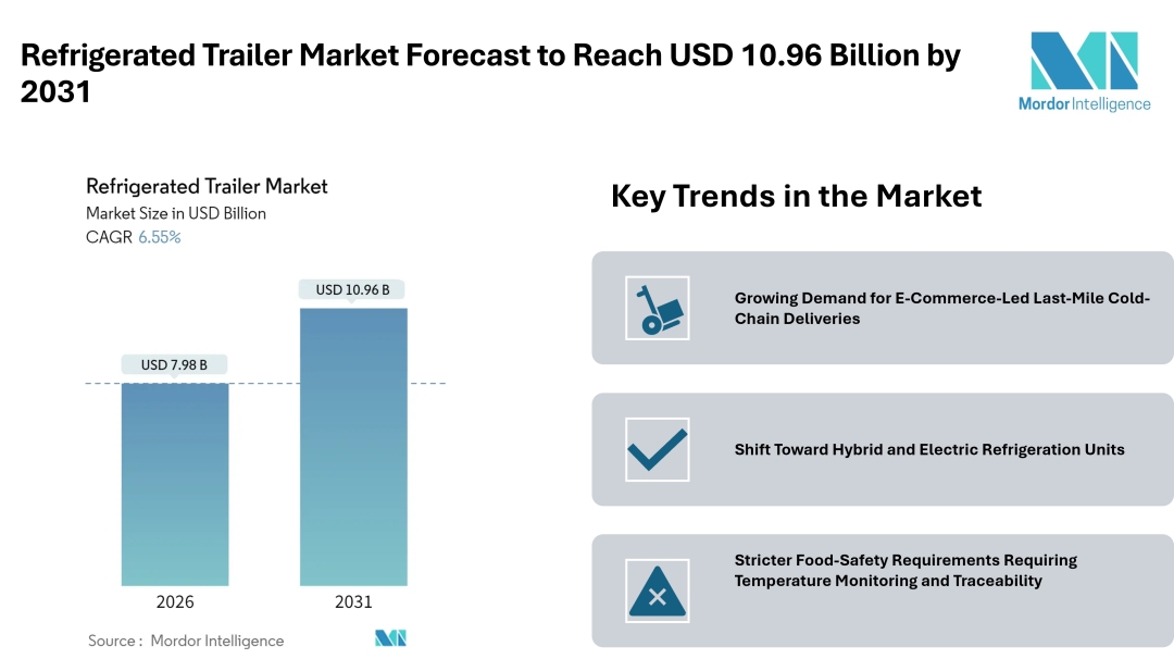 According to Mordor Intelligence, the refrigerated trailer market size was valued at USD 7.98 billion in 2026 to USD 10.96 billion by 2031, reflecting steady demand across both developed and emerging regions.