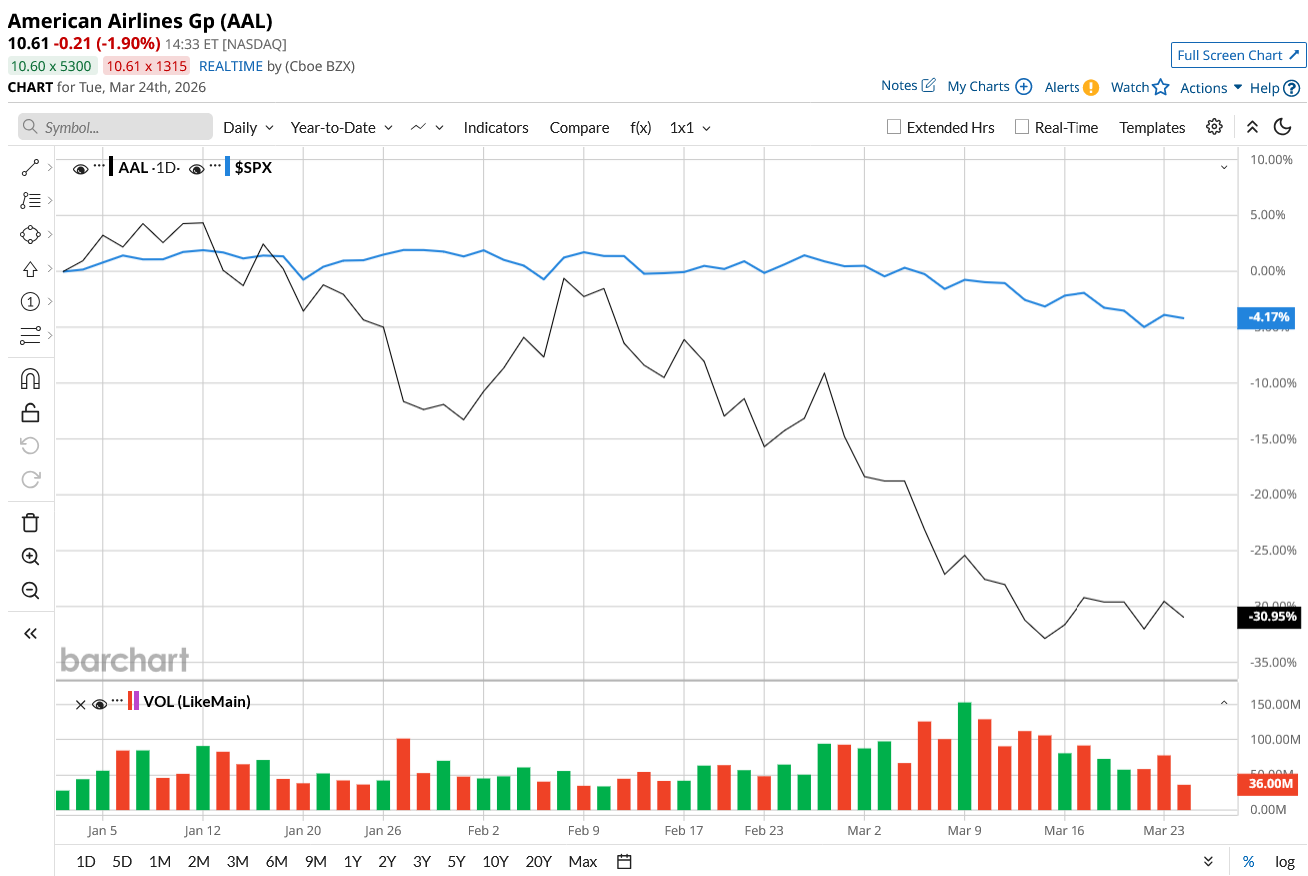 AAL stock is down 32% year-to-date (YTD), compared to the S&P 500 Index ($SPX) dip of 4.2%.