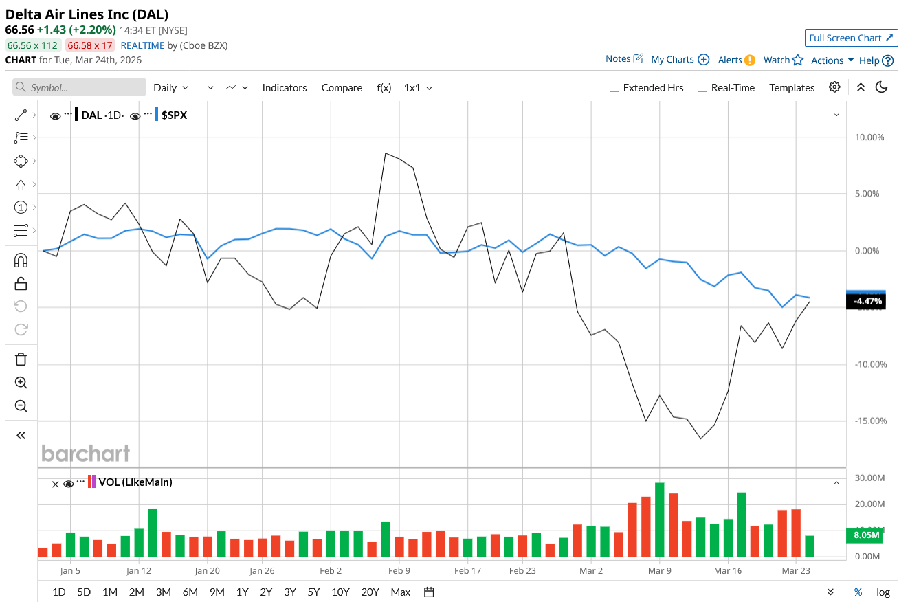Delta stock is down 5% YTD, better than AAL’s dip so far this year.