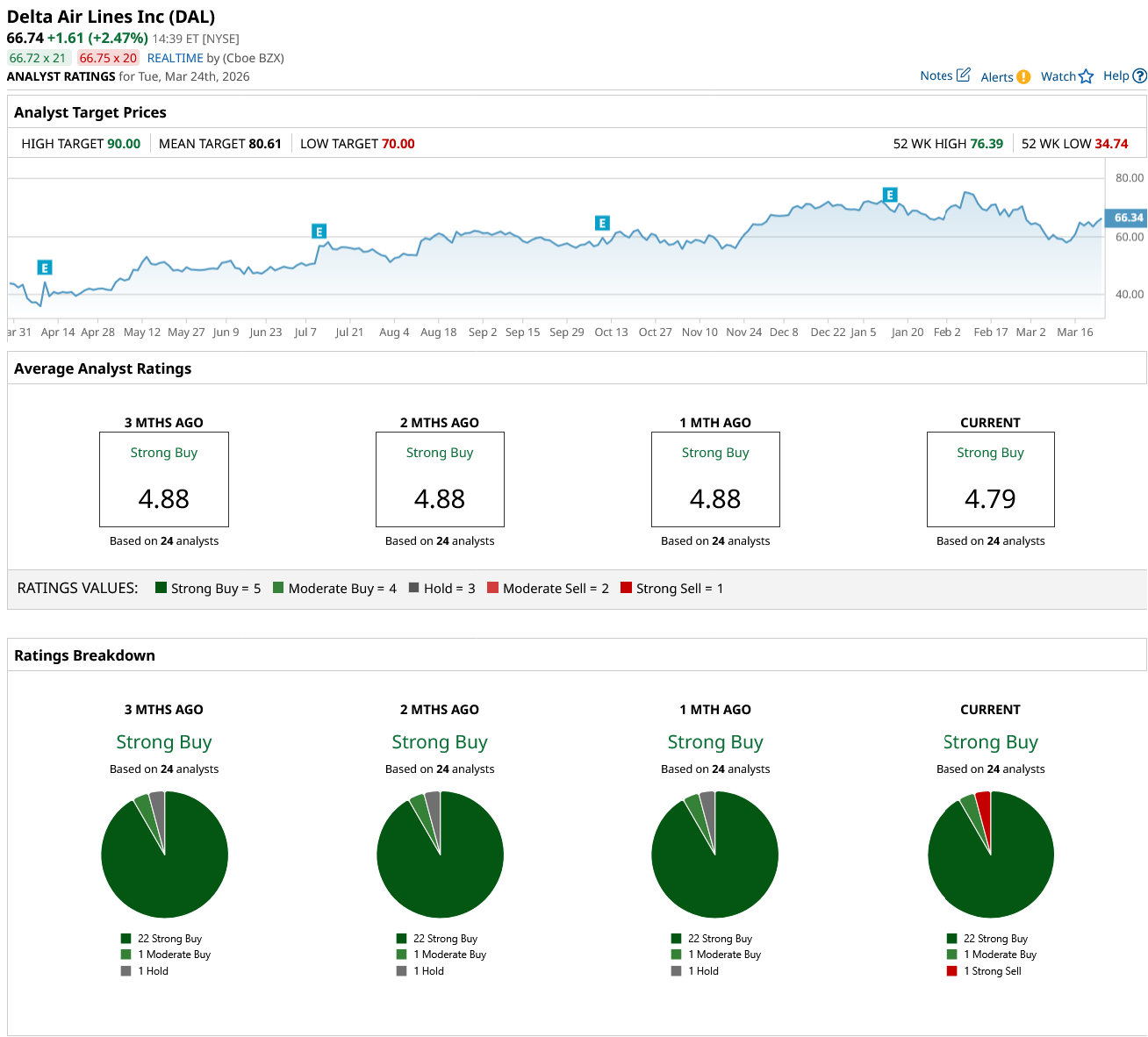 Overall, Wall Street rates DAL stock as a “Strong Buy.” Of the 24 analysts covering the stock, 22 rate it a “Strong Buy,” one says it is a “Moderate Buy,” and one rates it a “Strong Sell.” The average target price of $80.61 suggests the stock can climb by 21% from current levels. Plus, the high price estimate of $90 suggests AAL has an upside potential of 35% over the next year.