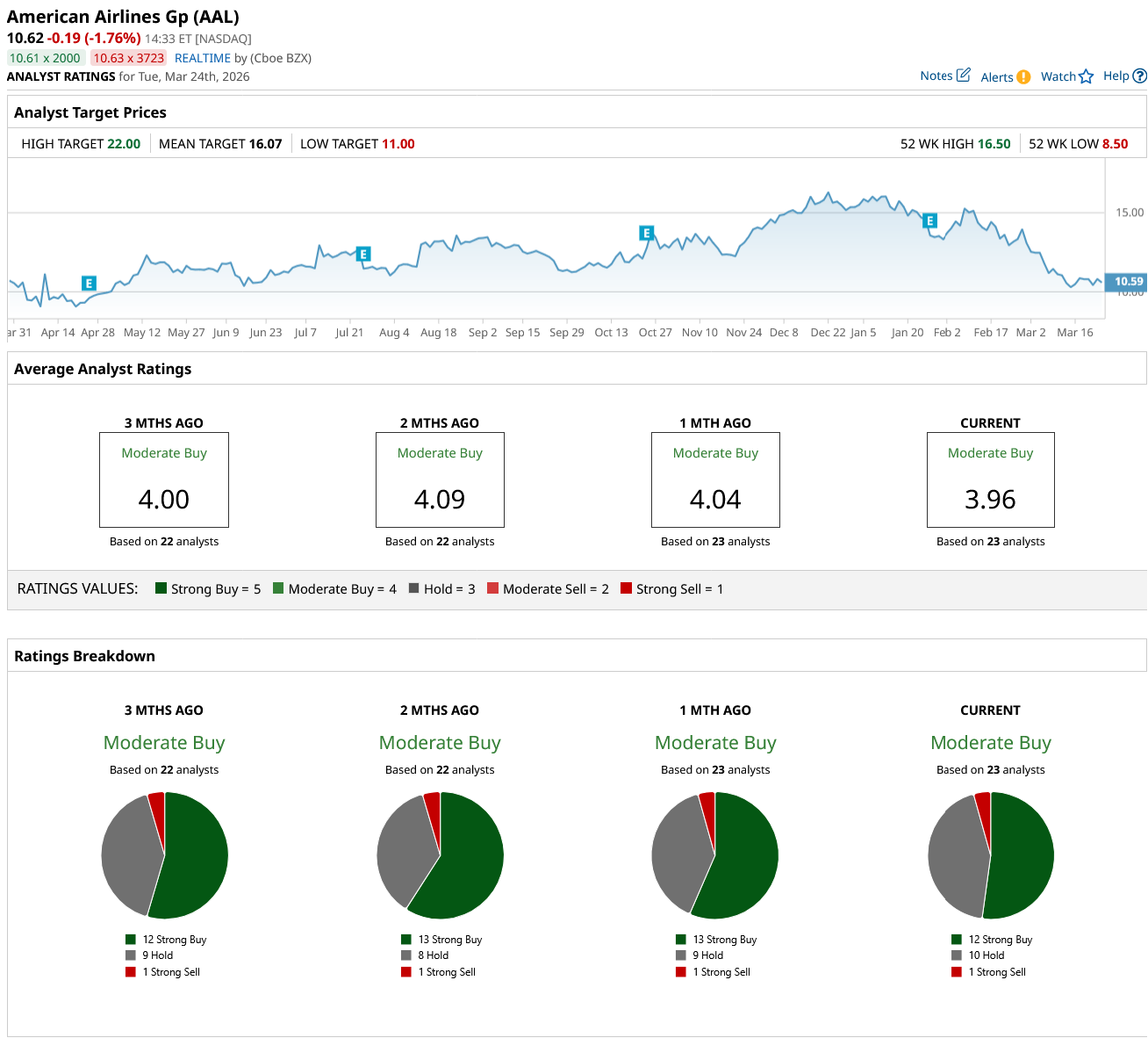 Overall, Wall Street rates AAL stock as a “Moderate Buy.” Of the 23 analysts covering the stock, 12 rate it a “Strong Buy,” 10 rate it a “Hold,” and one says it is a “Strong Sell.” The average target price of $16.07 suggests the stock can climb by 51% from current levels. Plus, the high price estimate of $22 suggests AAL has an upside potential of 107% over the next year.