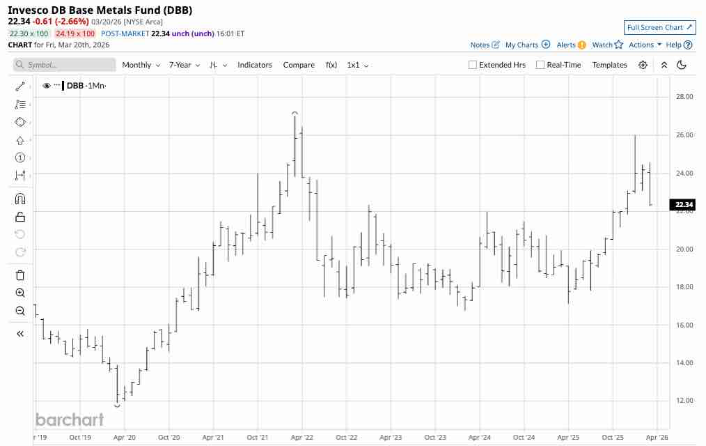 After falling to an $11.91 per share low in March 2020, DBB’s price reached a $27.01 high in March 2022, following Russia's invasion of Ukraine and a rise in aluminum prices to a record high. After consolidating between $17 and $22 per share from 2022 through 2025, DBB has made higher lows and higher highs since April 2025. At $22.34 per share, the upside target is the 2022 record high of $27.01.