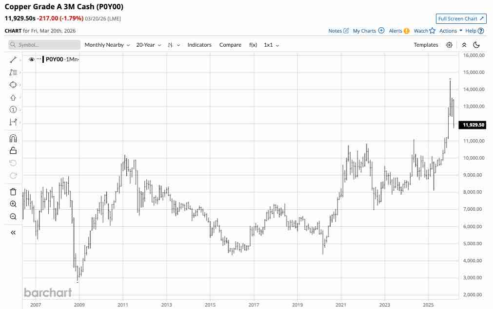 With aluminum prices recently moving above the 2008 peak at the most recent high, the upside target is the 2022 high. Aluminum’s path of least resistance remains bullish in late March 2026, but the price action over the coming weeks and months will depend on the war with Iran. Meanwhile, aside from missile and drone attacks impacting production facilities, exports from the UAE and Bahrain depend on passage through the Strait of Hormuz, the critical chokepoint for crude oil and other commodities, including aluminum.