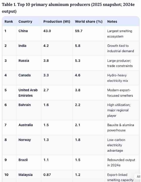 The top ten aluminum-producing countries in 2025 were as follows: