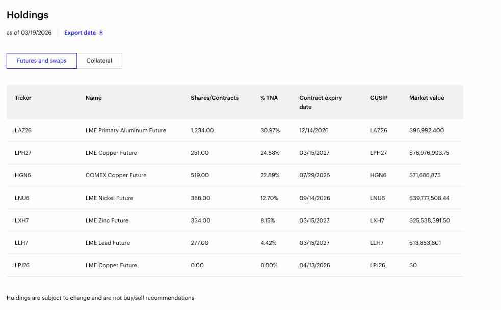 The war with Iran and its regional retaliation will continue to impact global aluminum prices. The Invesco DB Base Metals Fund (DBB) owns a portfolio of LME base metals. At $22.34 per share, DBB has over $259 million in assets under management. DBB trades an average of over 537,000 shares per day and charges a 0.74% management fee. DBB’s most recent holdings include: