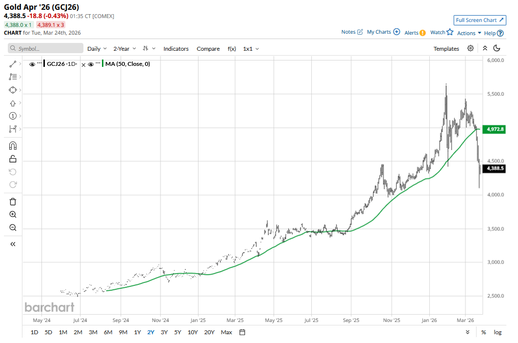 The Iran war and the resulting rise in energy prices have taken a toll on global stock markets, and while there was a relief rally yesterday, March 23, the overall sentiment remains “risk-off.” Ideally, gold should have outperformed in such periods of geopolitical tensions, as it is the ultimate safe-haven asset. However, the precious metal has plunged into bear market territory and, in fact, has fared much worse than stocks over the last couple of weeks.