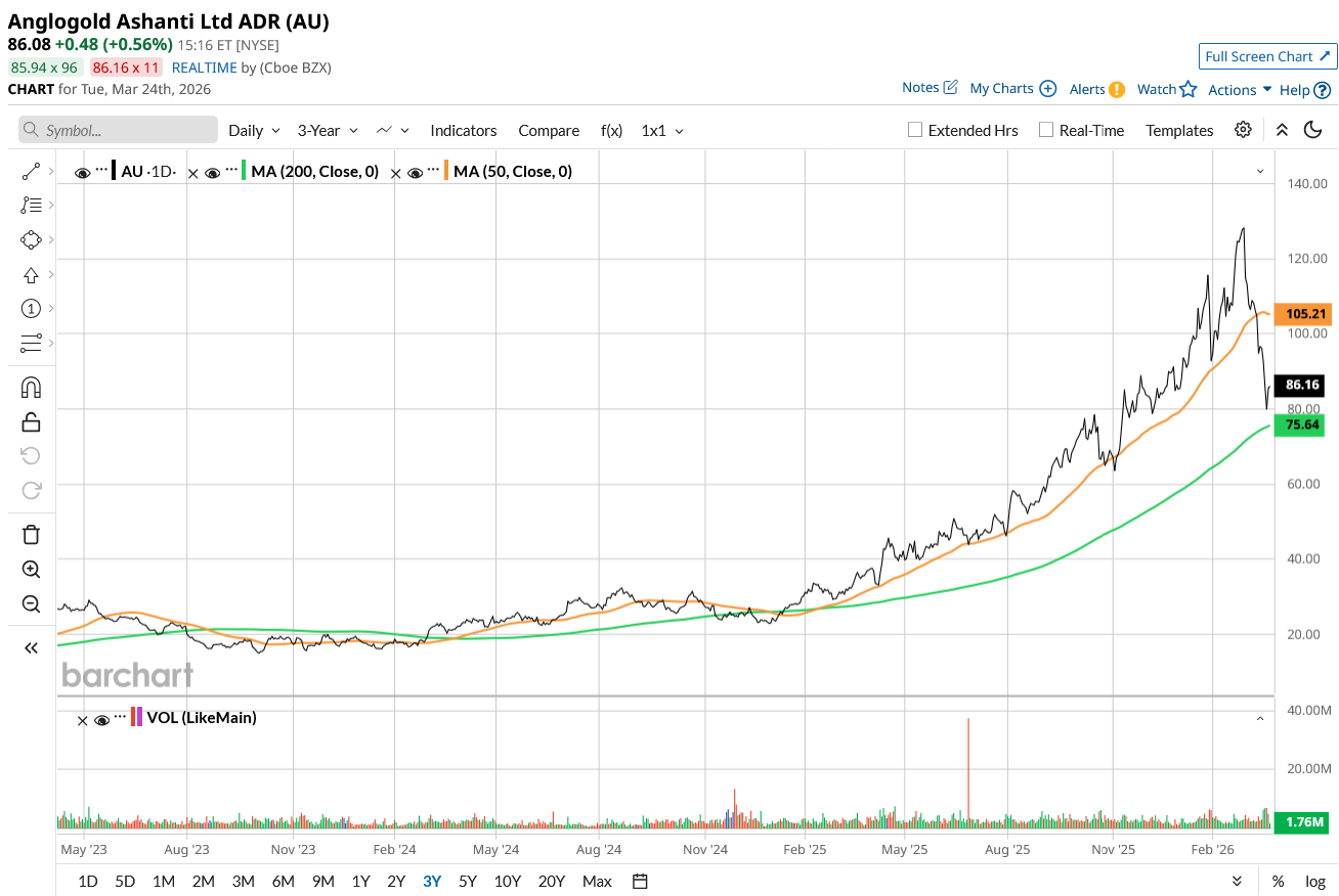 AU is ultimately a play on gold prices, and if anything, its price action is more sensitive to gold prices compared to many of its peers. The high leverage to gold prices helped AngloGold outperform the VanEck Gold Miners ETF (GDX) last year, but on the flip side, it tends to fall more than other gold miners when gold prices plunge, and its drawdown from the 2026 peak is much wider than GDX.