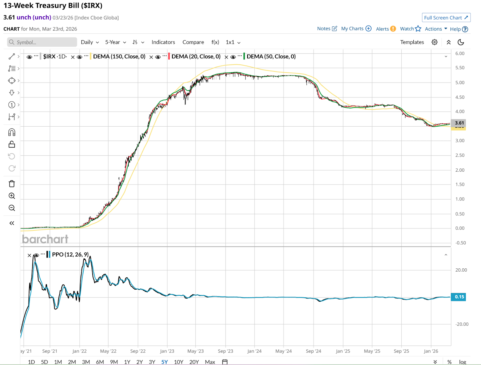 And here is the path of 3-month T-bills, which is also captured in the performance of the SPDR BBG 1-3 Month T-Bill ETF (BIL), one of several peer ETFs that are as close as ETF traders get to a money market fund.